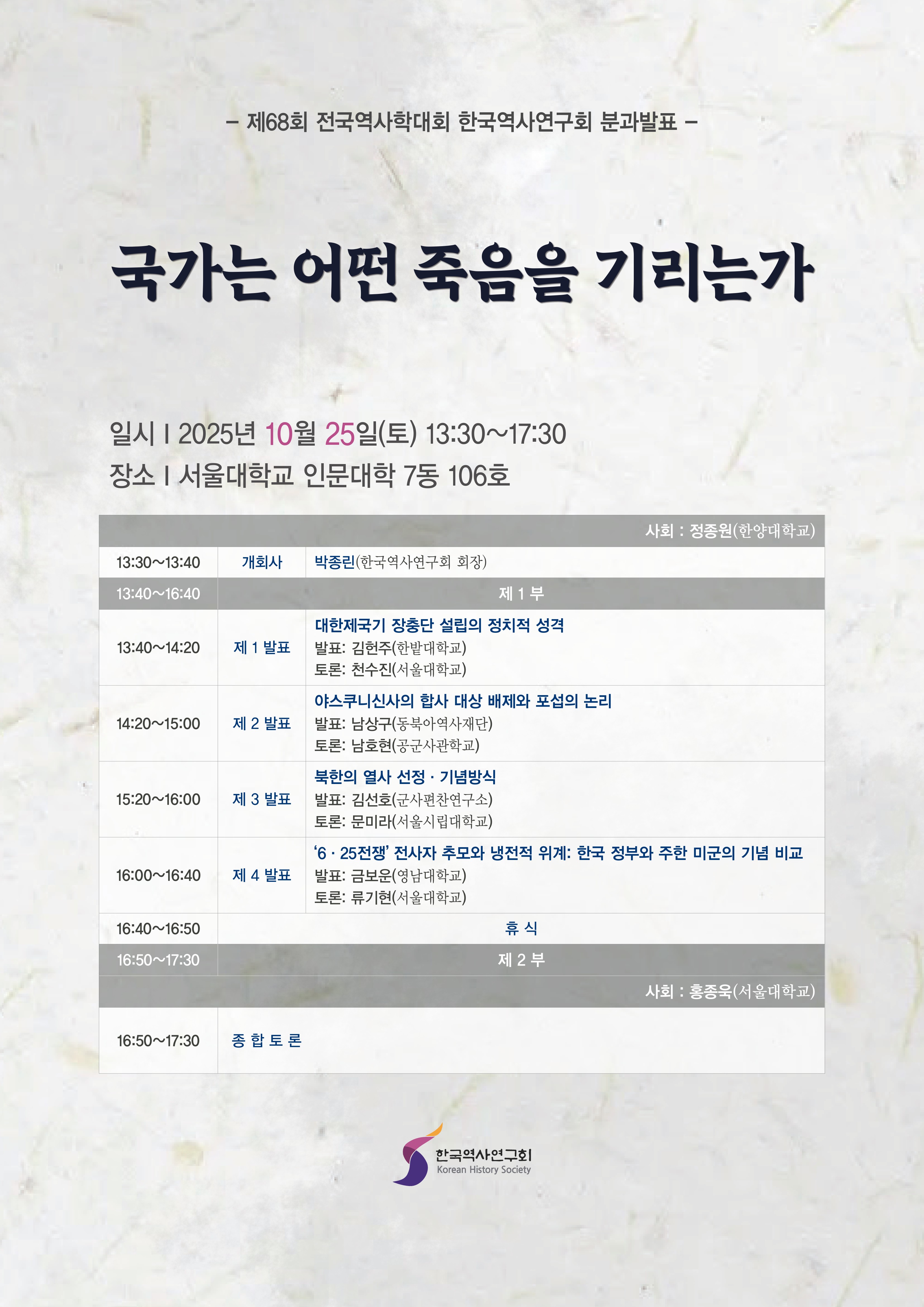16:00~16:40 | 제4발표 ‘6·25전쟁’ 전사자 추모와 냉전적 위계: 한국 정부와 주한 미군의 기념 비교 | 발표자: 금보운(영남대학교) 토론자: 류기현(서울대학교) |