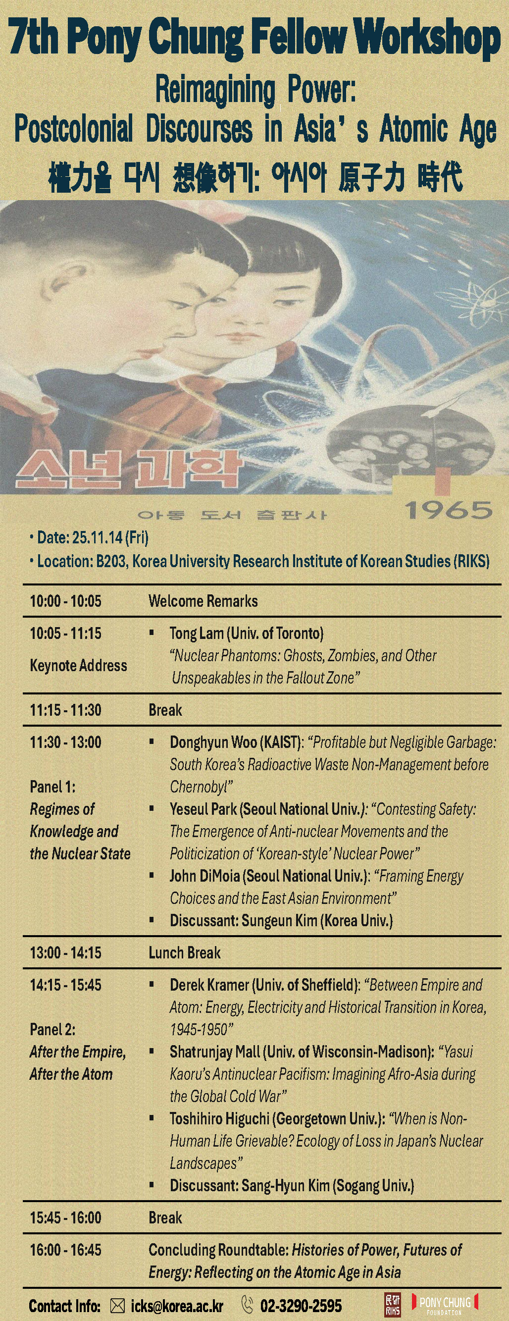이번 워크숍은 "Reimagining Power: Postcolonial Discourses in Asia's Atomic Age(權力을 다시 想像하기: 아시아 原子力 時代)"를 주제로 진행될 예정이니, 선생님들의 많은 관심 부탁드립니다.