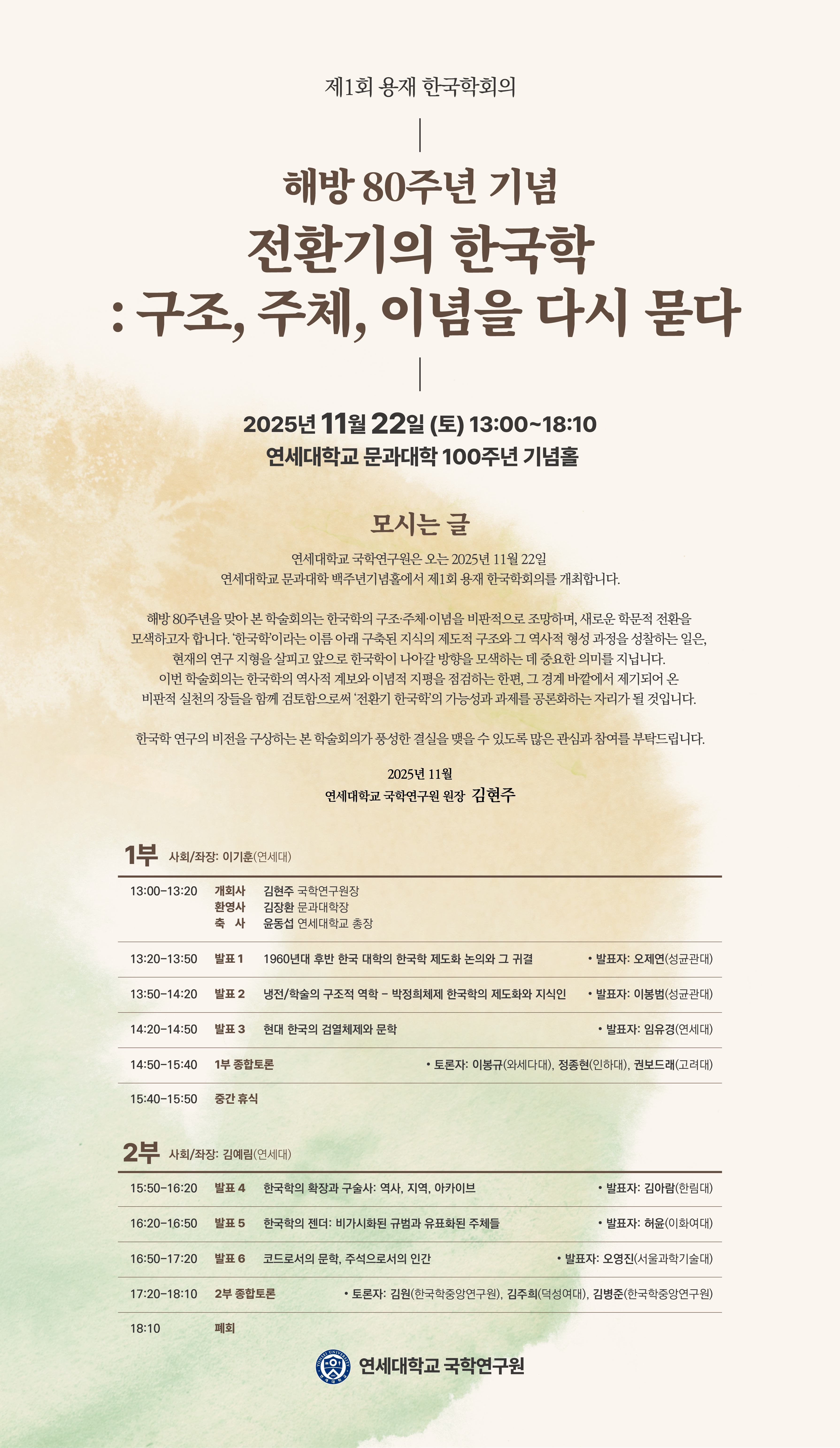연세대학교 국학연구원은 오는 2025년 11월 22일 연세대학교 문과대학 백주년기념홀에서 제1회 용재 한국학회의를 개최합니다.